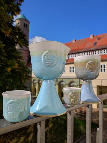 Das Set umfasst einen Gießkelch, Patene, Einzelkelche und einen Krug. Alle Teile sind einzeln erwerbbar.