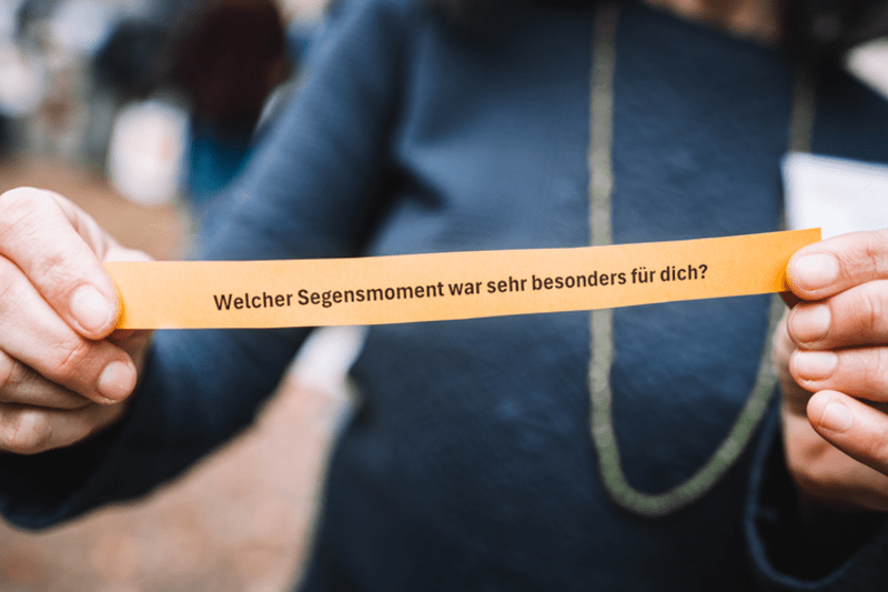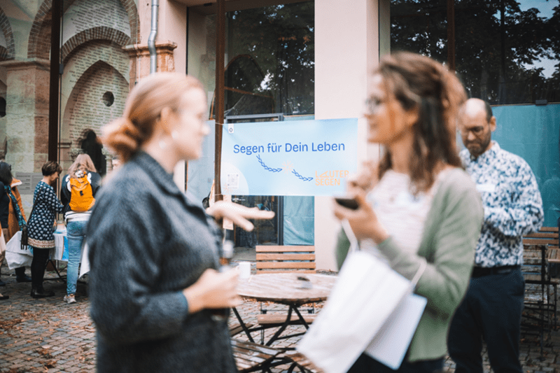 Das multiprofessionelle Team aus Kathrin Beushausen (Diakonin), Carla Michaelis (FSJlerin), Elisabeth Rabe-Winnen (Pastorin), Til von Dombois (Popkantor) und Britta Strohmeier (Sozialmanagerin) wurde in Planung und Durchführung der Veranstaltung im Michaeliskloster unterstützt – zum einen von den Kolleg:innen des Michalisklosters, zum anderen von lauter Segensmenschen, die bereits jetzt in Initiativen rund um Segen in unserer Landeskirche unterwegs sind. Und so erlebten die Gäste bei ihrer Ankunft Segen in verschiedenen Farben und Formen im Innenhof des Michaelisklosters: passend zu Material (das künftig auch über Lauter Segen entleihbar ist) konnte die Beine baumeln in der Segensschaukel, Gespräche entstehen am Bauchladen oder eine Umfrage zum Segen Platz haben am Bällebarometer. Vor allem aber nutzen die Gäste die Gelegenheit, zum Thema ins Gespräch zu kommen und sich miteinander zu vernetzen.