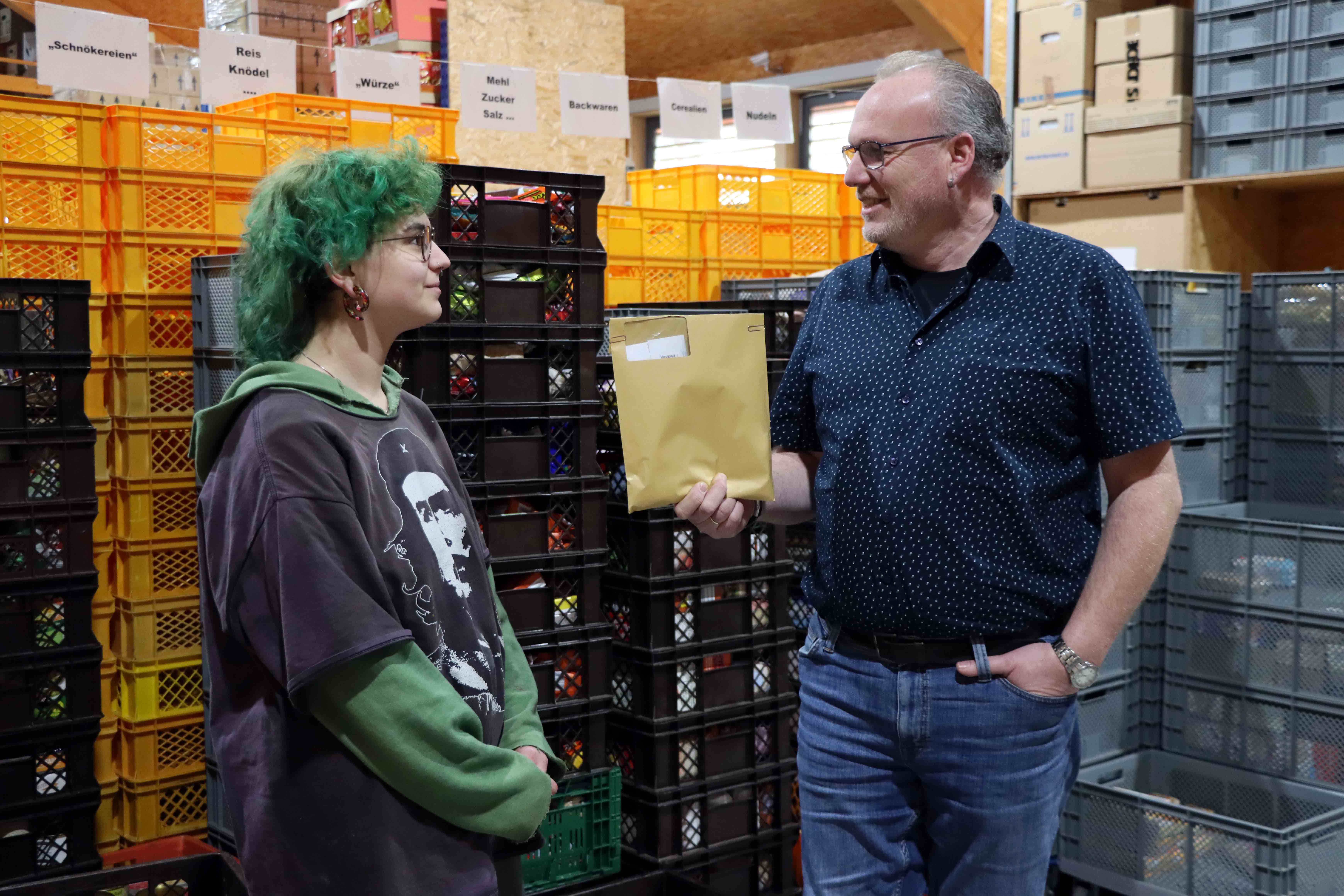 1500 Lebensmitteltüten geben Andreas Handzik und seine Kollegen jede Woche an Bedürftige aus. Nudeln, Mehl, Kaffee, Dosenfrüchte und Frühstücksflocken sind darin.