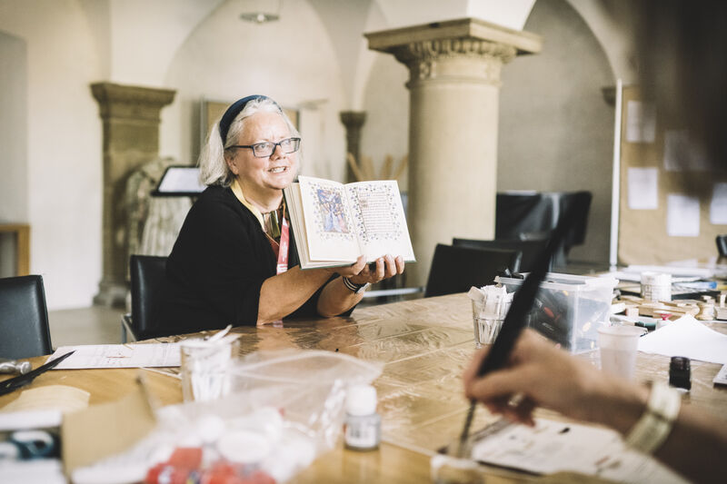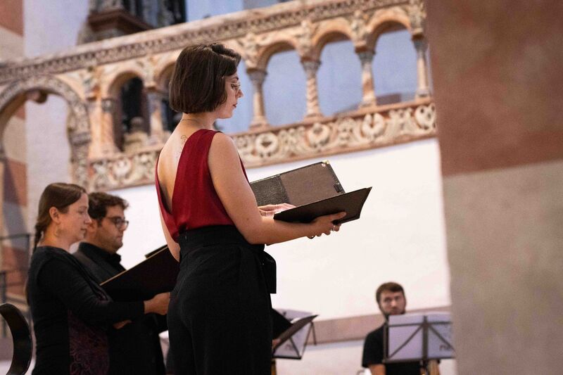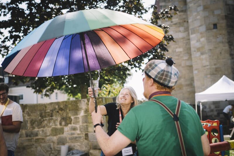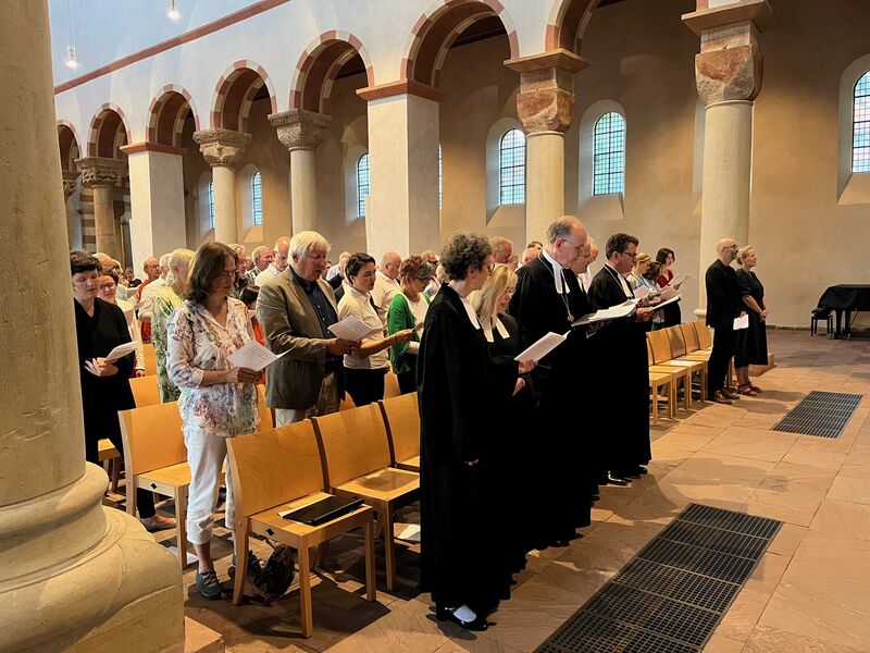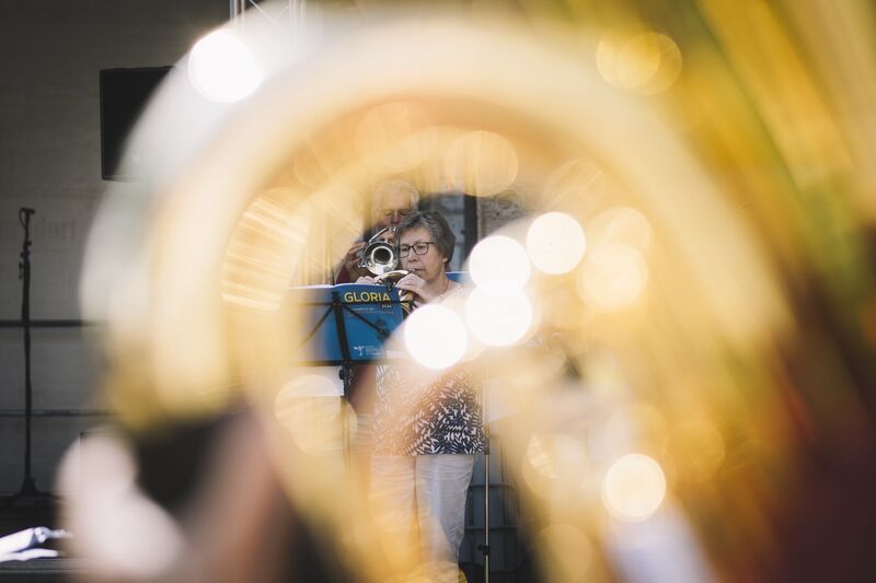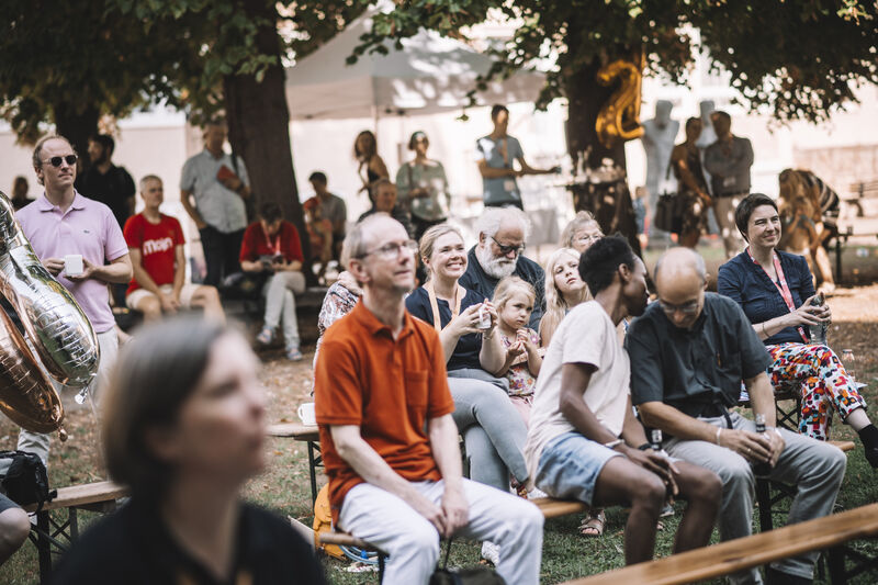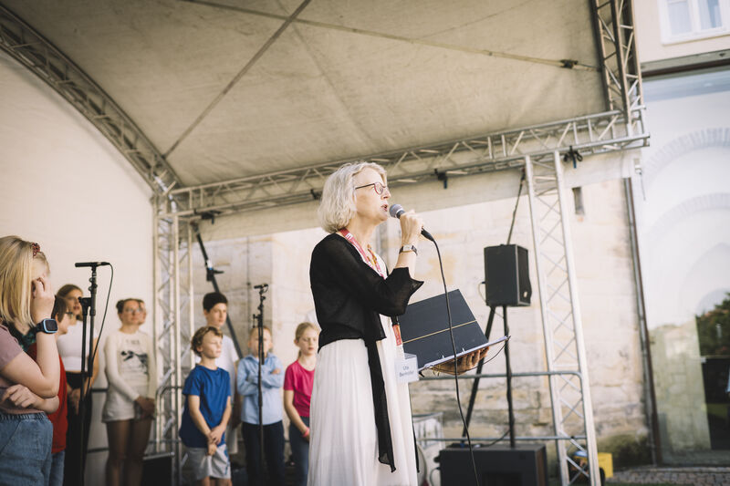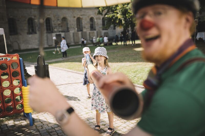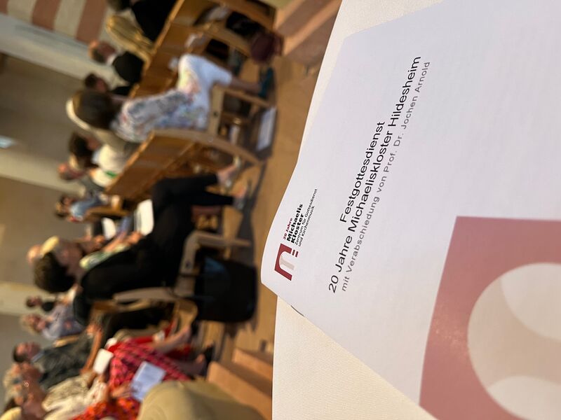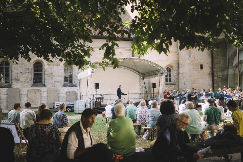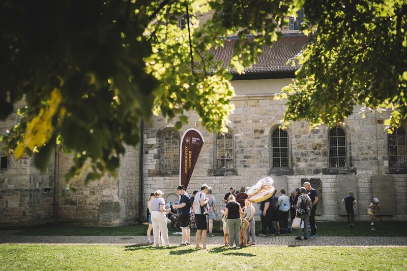 Die Bühne im Innenhof haben Bläser:innen aus Hildesheim und Umgebung bespielt, die Singschule Moritzberg eroberte sie mit ihrem Musical "Die Krone der Schöpfung?". Darüber hinaus standen Gospel-, Pop- und Chorkonzerte auf dem Programm. Bei Mitsingangeboten konnten sich die Besucher:innen selbst musikalisch ausprobieren. In Band-, Posaunenspiel-, kreativen Workshops wurde Kirchenmusik greifbar, in Schreibwerkstätten konnten sich die Teilnehmenden dem Himmel auf dem Papier nähern. Es gab Liebe aus dem Bauchladen, Segen to go mit bunten Fäden und Waffeln am Stiel vorm Weltkulturerbepanorama St. Michaelis. Darüber hinaus stellte sich das Michaeliskloster bei Führungen durch das historische Gesangbucharchiv und durch das Hotel und Tagungshaus vor.