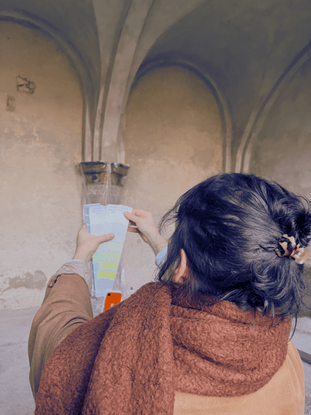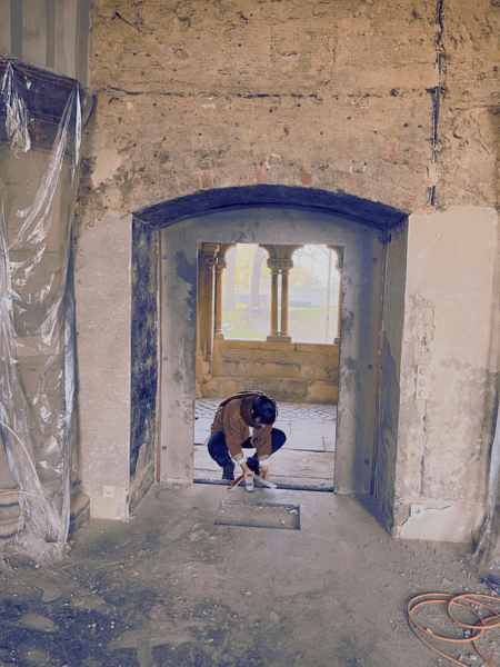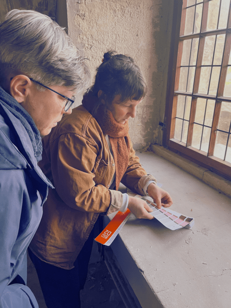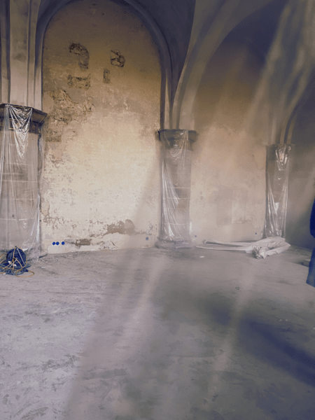 Dienstagvormittag. Noch dauert es ein paar Stunden, bis die Sonne ihre Strahlen durch die Fenster der Kreuzkapelle im Michaeliskloster schicken wird. Lichtgrau. Sandra Holzinger hält ihre Farbkarten vor eine der Wände. Der Boden unter ihren Füßen ist mit Staub bedeckt, der Putz löchrig, die Stelen von Folien geschützt. "Der Raum ist auf Null gesetzt", sagt Sandra Holzinger.